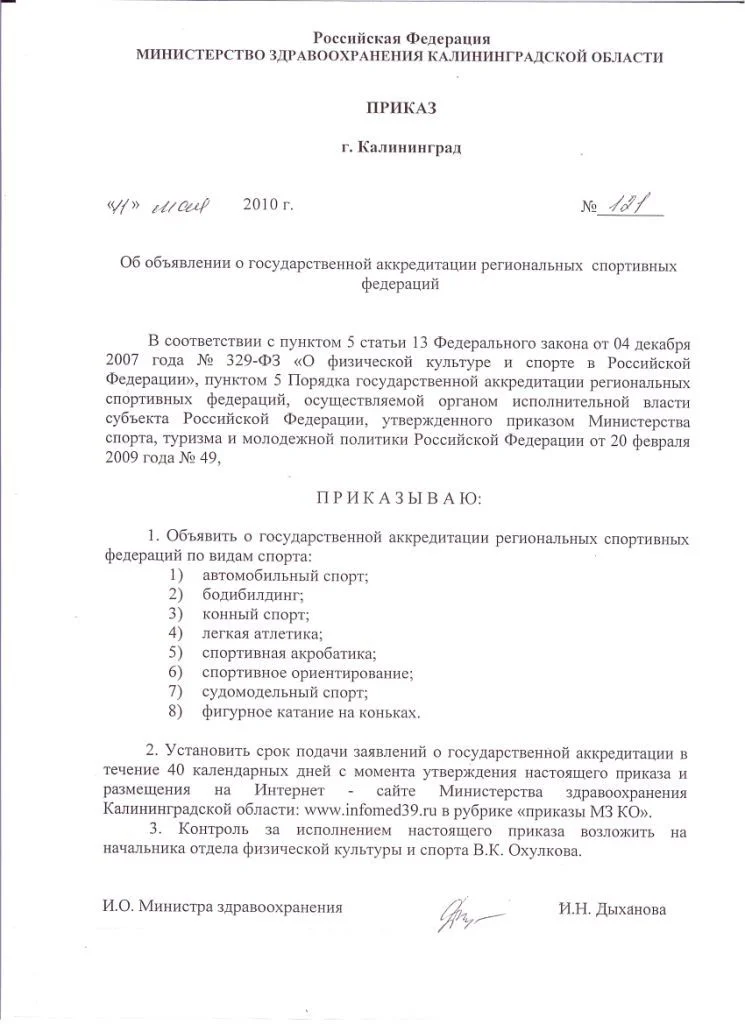 | Приказ Министерства здравоохранения Калининградской области от 11 мая  2010 г. №121 Опубликован 12.05.2010 | Об объявлении о государственной аккредитации региональных спортивных федераций | 81.56 Кб |  |